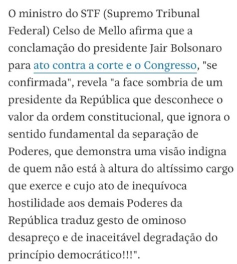 Por isso tem causado espécie o chamamento do sr. Presidente da República à iniciativa de segmento da sociedade contrária a existência de instituições republicanas. A livre manifestação popular é democrática, todos podem pensar e dizer como acham que o Estado nacional deve se organizar. Daí o chefe de um dos três Poderes convidar seus seguidores ao enfrentamento aos demais que lhe são iguais perante a lei não parece atitude adequada.