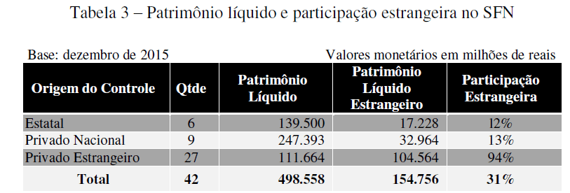 Aqui apresentamos o panorama da presença externa no SFN em 2015. Em breve voltamos para avaliar se os interesses de governo nessa participação correspondem aos interesses nacionais e sugerir medidas para que esses capitais também promovam o desenvolvimento equilibrado do país e sirvam aos interesses da coletividade, como determina a Carta Magna.