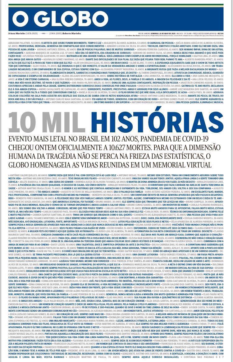 Em uma centena de anos nunca tivemos no Brasil perdas como as de agora. Habitamos hoje um mundo que sofre, o vírus já contaminou mais de quatro e meio milhões dos nossos semelhantes. Mas amanhã vai ser outro dia.
