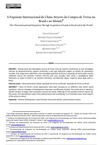 Do debate sobre o mundo do trabalho na China veio em contribuição estudo de acadêmicos capixabas* sobre a aquisição chinesa de terras mundo afora. O material foi publicado no 1º semestre de 2014 na revista eletrônica da PUC/RS.
