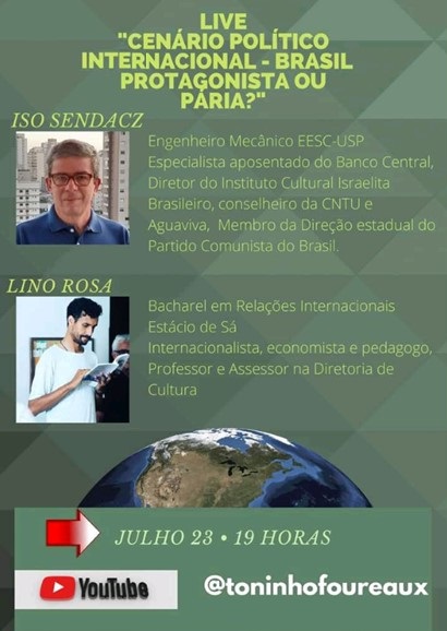 Ao lado do professor Lino Rosa, estivemos no canal de Toninho Foureaux para uma conversa sobre o cenário político internacional, procurando responder à questão: Brasil, protagonista ou pária?