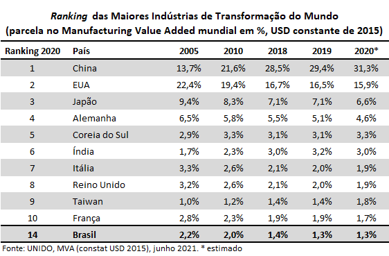 A UNIDO (United Nations Industrial Development Organization) estima o valor adicionado da indústria de transformação mundial ter caído -8,4% em 2020, devido à pandemia de Covid-19. Desencadeou uma crise sem precedentes, impactando a fabricação de bens e causando rupturas nas cadeias globais de valor (CGV), bem como uma desaceleração geral da demanda, segundo a CARTA IEDI 1097, publicada em 06/08/2021.
