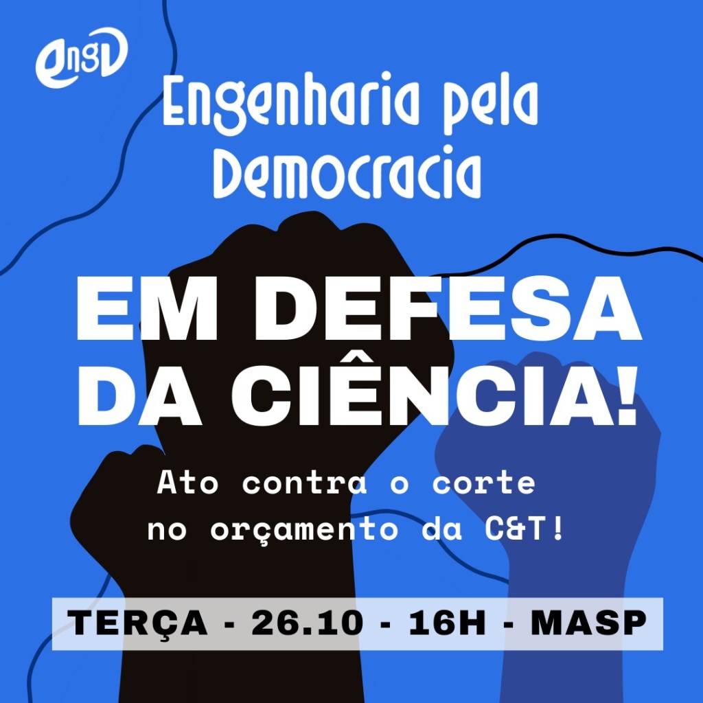 A Engenharia pela Democracia – EngD – já havia se manifestado nas redes contra a acerba redução dos investimentos públicos em Ciência e Tecnologia. Mas no dia 26 de Outubro somou-se nas ruas aos cientistas, pesquisadores e estudantes nas demonstrações sobre o quanto vale a ciência, subscrito pela Sociedade Brasileira para o Progresso da Ciência, a UNE e mais duas dezenas de entidades.