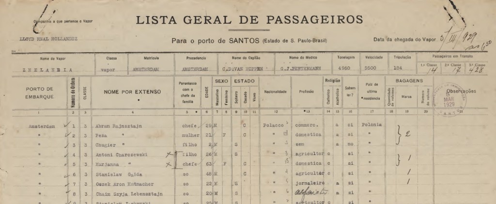 Em 5.3.1929 atracava o vapor Zeelandia, procedente de Amsterdam e conduzido por Van Hoppen, com Hugueta Sendacz e seus pais Abrão e Pola Rajnsztajn à bordo. Antes de subir a serra, pernoitaram na pensão Brickmann.