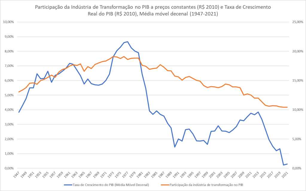A desaceleração do crescimento da economia brasileira tem início em 1977, durante o governo do General Geisel, quando a média móvel de 10 anos da taxa de crescimento atinge seu valor máximo a 8,67% a.a, caindo progressivamente até alcançar 1,64% a.a no primeiro ano do segundo mandato do Presidente Fernando Henrique Cardoso.