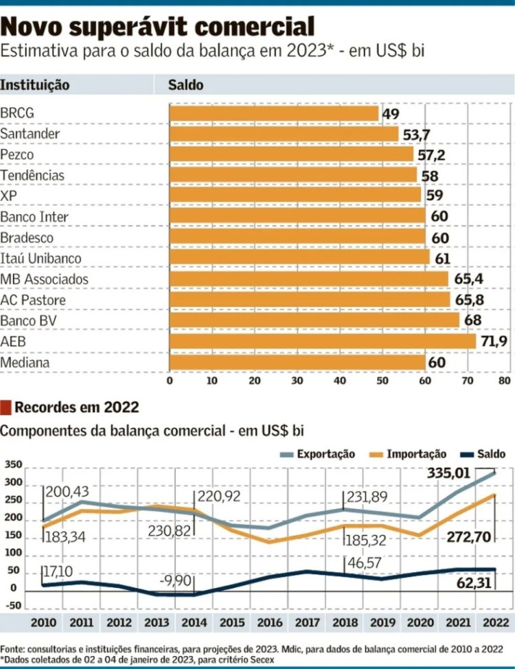 Os indicadores são robustos e mostram importante contribuição do balanço para o setor externo. Os resultados de 2022, porém, contaram com papel importante da alta de preços, que deve ajudar menos em 2023. Os dados de comércio foram divulgados ontem pelo Ministério do Desenvolvimento, Indústria e Comércio (Mdic).