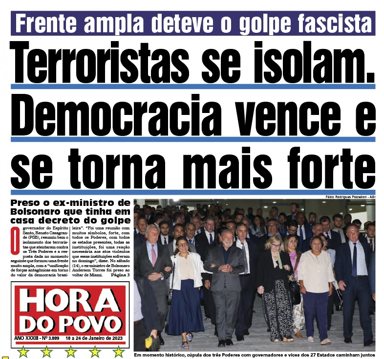Lula reúne 27 governadores e vices contra o terrorismo: “eles querem golpe e não vai ter”. Depois da reunião, Lula convidou os governadores para irem a pé vistoriar o que os vândalos, terroristas e fascistas fizeram no STF e prestar solidariedade à presidente da Corte, Rosa Weber. Leia a matéria completa.