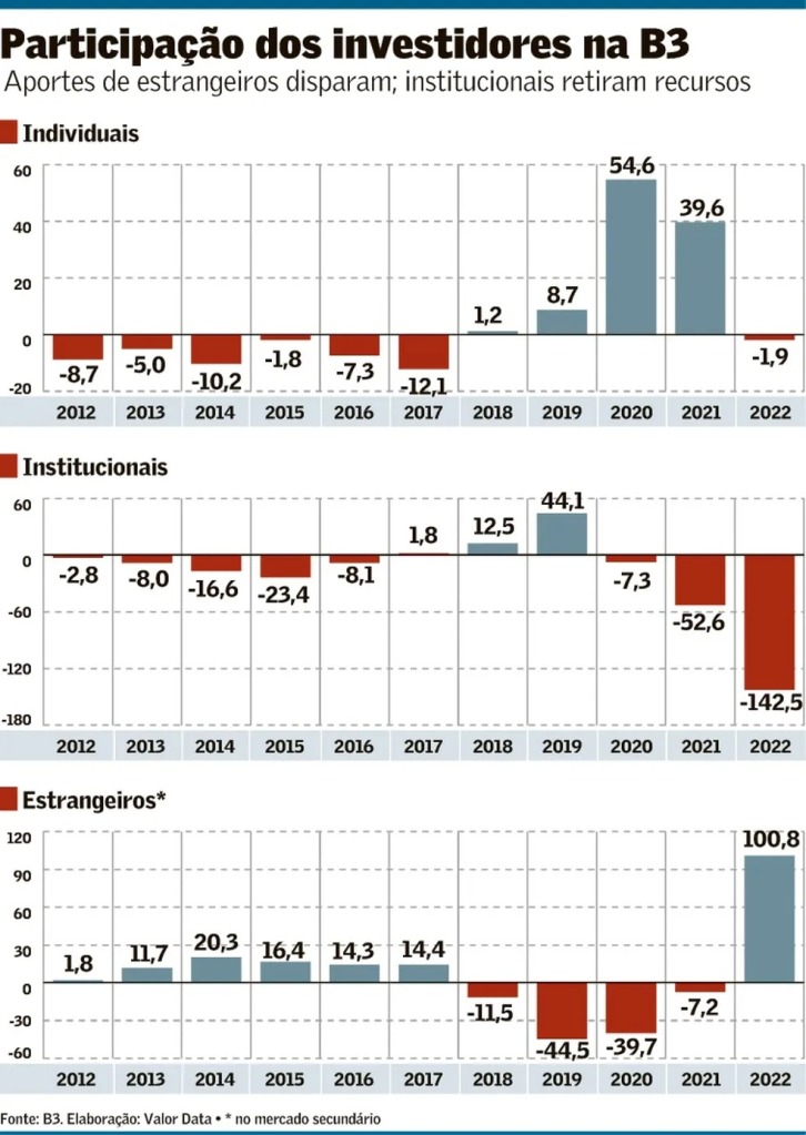 O investidor estrangeiro colocou na bolsa brasileira o maior volume da história em 2022. A entrada de recursos de investidores não residentes nas ações já listadas na B3 totalizou R$ 100,8 bilhões no ano passado, a despeito da forte volatilidade do mercado. A percepção de que muitos papéis locais estavam baratos, a surpresa positiva do PIB e a expectativa de que o Banco Central (BC) pudesse começar a reduzir a taxa de juros já no começo de 2023 atraíram dinheiro internacional.