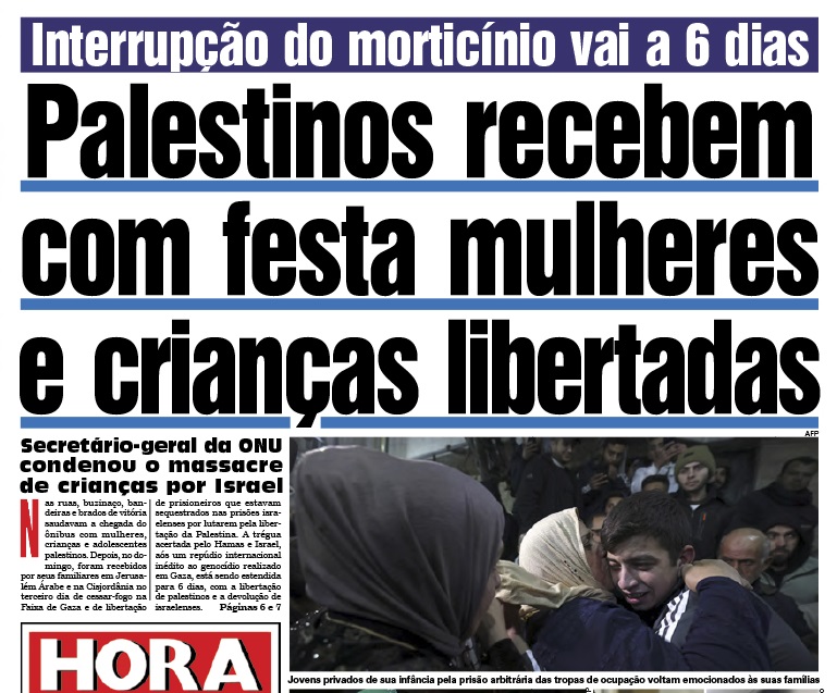 Uma multidão recebeu as mulheres, crianças e adolescentes palestinos com buzinaço, agitar de bandeiras, e fogos de artifício, em sua chegada de ônibus ao centro da cidade de Beitunia, após sua soltura da prisão de Ofer que fica na mesma cidade. Veja a cobertura.