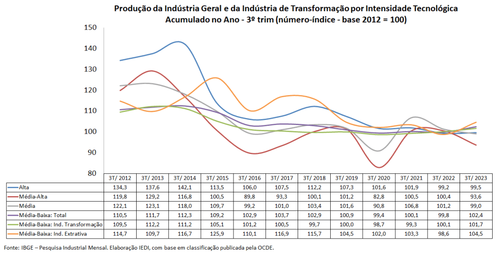A indústria brasileira tem apresentado um quadro de estagnação em 2023, mas excluídas as atividades extrativas, o desempenho recente é ainda mais desfavorável, acumulando perdas sucessivas. Quanto maior a intensidade tecnológica, pior o resultado no 3º trim/23. O valor adicionado da indústria de transformação, como mostraram os últimos dados do PIB, recuou -1,5% no 3º trim/23 e -1,6% em jan-set/23. Já a produção física do setor encolheu, respectivamente, -1,1% e -1,2%, sempre em comparação com o ano anterior.