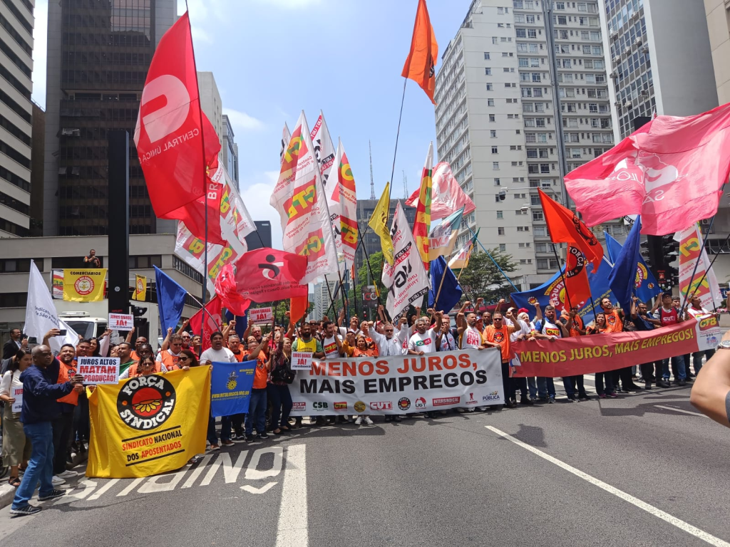 Vermelho – Centenas de trabalhadores e dirigentes das principais centrais sindicais — Força Sindical, CUT, UGT, CTB, CSB e Nova Central — ocuparam a frente da sede do BCB. O protesto teve como principal bandeira a redução imediata da taxa básica de juros, a Selic, atualmente em 15% ao ano — o maior patamar desde 2006. As entidades apontam que o próprio Boletim Focus, do BC, vem reconhecendo o controle da inflação. As taxas elevadas desestimulam o crédito, o consumo e os investimentos, comprometendo a geração de empregos e a renda da população.