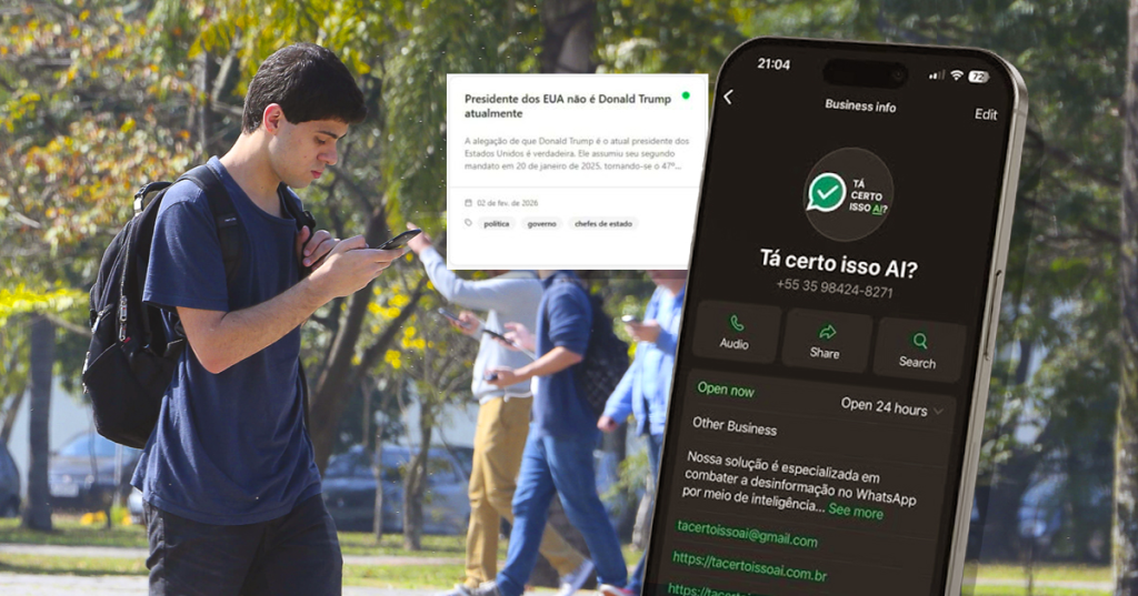 Jornal da USP – Atentos ao impacto que a desinformação pode exercer sobre os rumos do Brasil, especialmente com o horizonte das eleições de 2026, três alunos do Instituto de Ciências Matemáticas e de Computação (ICMC) da USP, em São Carlos, desenvolveram um sistema de verificação de fatos que funciona no aplicativo para celulares WhatsApp. Intitulado Tá certo isso AI?, o chatbot utiliza IA e é capaz de analisar e combinar diferentes tipos de informação – como áudio, vídeo, texto ou imagem –, para verificar mensagens por meio de fontes confiáveis.