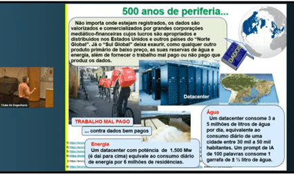 Dantas concluiu posicionando-se contra o modelo de incentivo à instalação de data-centers estrangeiros no Brasil, lembrando que a engenharia brasileira pode desenvolver soluções para as necessidades do país. Há uma reafirmação do pacto colonial, com uso da água e energia, como antes foi com o açucar e o ferro.