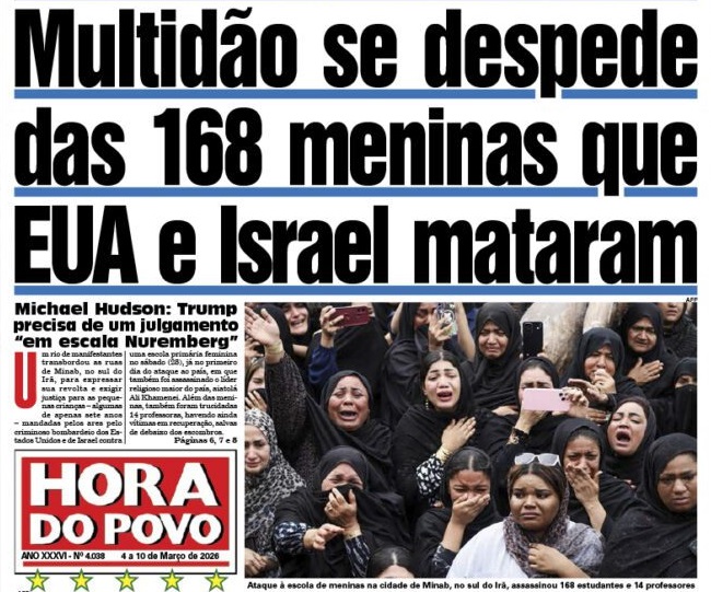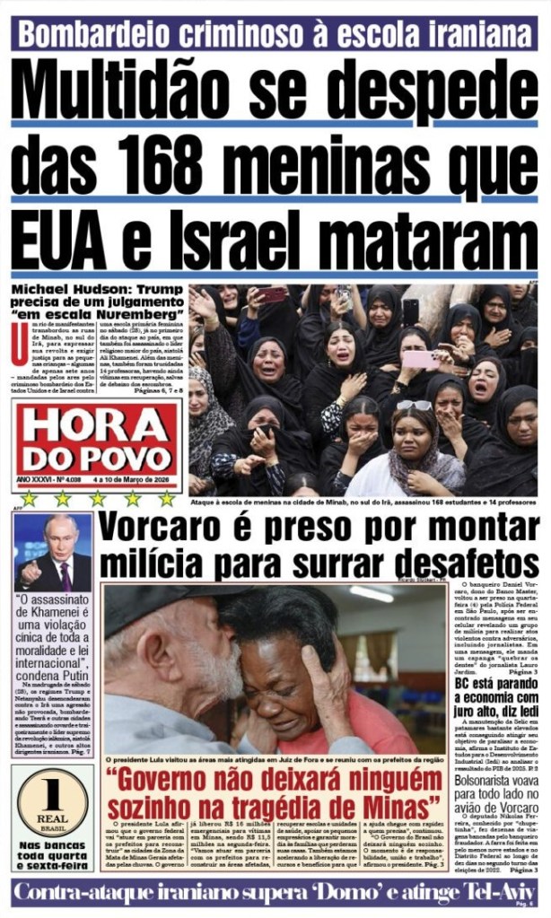 Mais de mil mortos no Irã, inclusive o líder máximo Khamenei; o país agredido respondeu aos ataques e contou com a solidariedade de Rússia, Espanha e China. A atriz Jane Fonda defende a soberania iraniana. Cuba também assegura defesa ante ameaças do norte.