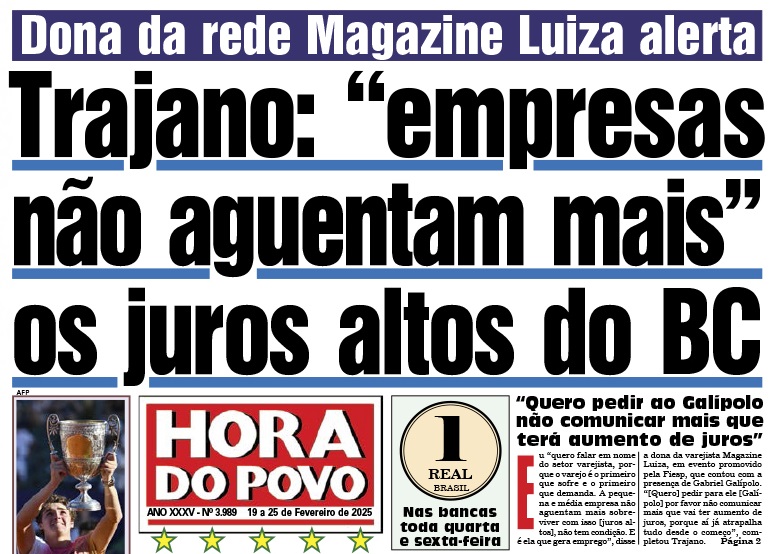 Empresas “não aguentam mais” os juros altos do BC, diz dona da Magazine Luiza Hora do Povo – Luiza Helena Trajano, em evento promovido pela Federação das Indústrias do Estado de São Paulo (Fiesp), que contou com a presença de Gabriel Galípolo: “Quero falar em nome do setor varejista, porque o varejo é o primeiroContinuar lendo “Manchetes do dia – 17.2.2025”